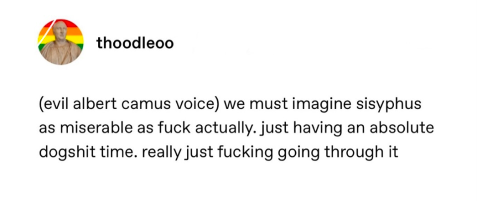 I want to remind y’all to send money to my fundraiser! Keep Me Running! I’ve been listening to this podcast quite a bit lately and this recent episode was genuinely fascinating. Math isn’t my strong suit, but I like it when other people are good at it. I really like it (intellectual stimulation is basically a kink, I’m starting to speculate). The only math I really think of is the Pythagorean Theorem. There's this L shaped sidewalk that I encounter in my neighborhood. Every time I approach it (especially when I'm walking behind some slow ass people), I ask myself if I should stay on the sidewalk OR if I should take "the hypotenuse less traveled." And, every time, I shave off 5 seconds of my walk.